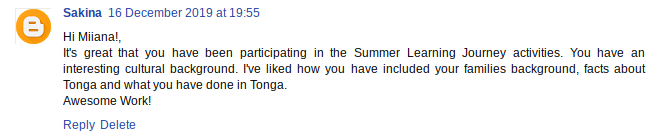 This week for Summer Learning Journey, I decided to comment on people's blog, about their activities. I have commented on 10 people. Each of them have great work they have done with the SLJ activities. I have commented on Farzana, Sulia, Florence, Taheesha, Avalon, Matthew, Miiana, Joel and Fau's blogs.